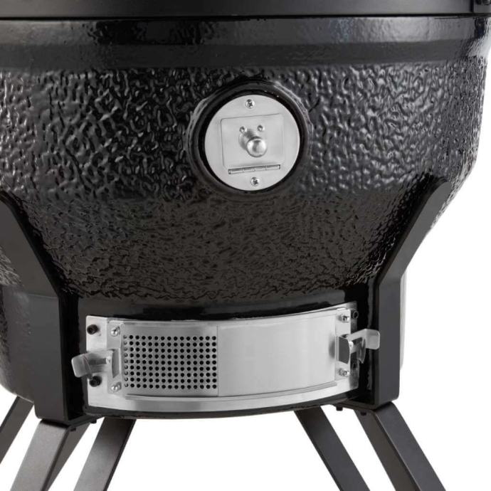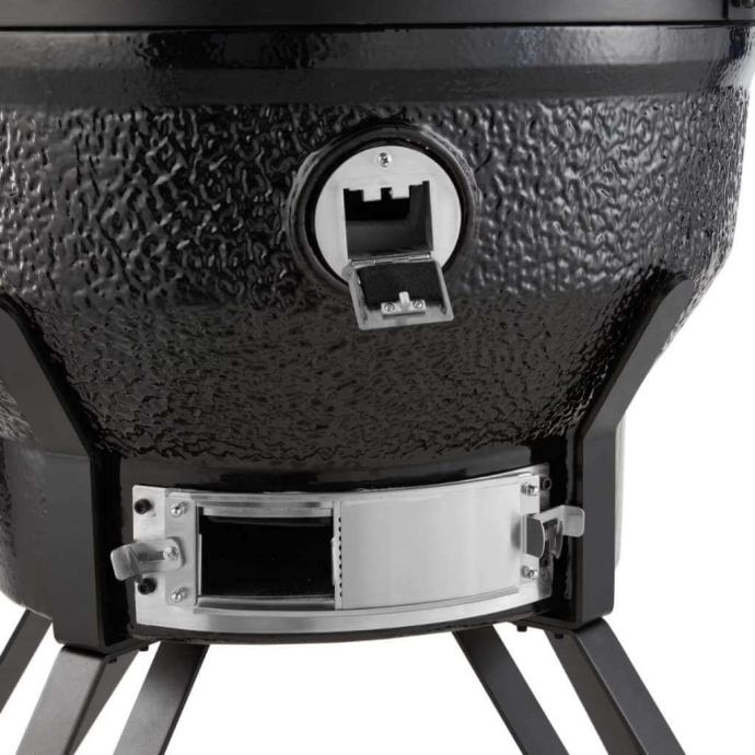 Podesivi dovod vazduha na dnu i izlaz vazduha u poklopcu obezbeđuju optimalnu cirkulaciju. Možete ga koristiti za podešavanje temperature vašeg posuđa. Podesive ploče za roštilj su takođe korisne jer vam omogućavaju da svoje posuđe postavite na idealnu visinu iznad vatre. Zid i posuda za vatru su keramičke, što osigurava da Kamado neće biti pod uticajem visokih temperatura ili temperaturnih razlika.