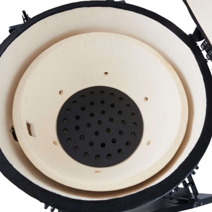 Podesivi dovod vazduha na dnu i izlaz vazduha u poklopcu obezbeđuju optimalnu cirkulaciju. Možete ga koristiti za podešavanje temperature vašeg posuđa. Podesive ploče za roštilj su takođe korisne jer vam omogućavaju da svoje posuđe postavite na idealnu visinu iznad vatre. Zid i posuda za vatru su keramičke, što osigurava da Kamado neće biti pod uticajem visokih temperatura ili temperaturnih razlika.