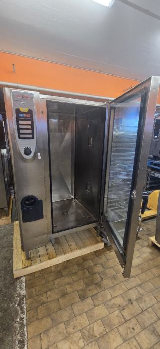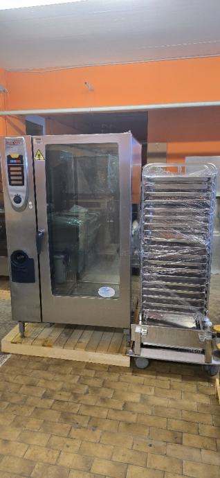 Veoma dobro očuvanu Elektro Parno konvekcijsko pečnicu Rational SCC 202, Care Control, kapacitet 20xGN 2/1, ili 40xGN 1/1, sa kolicima, za 300-500 obroka, primeren za svadbene salone, cateringe, družbene prehrane, hotele, veče restorane, škole itd. Touch display, samopranje, programi za vse vrste jela... U konvektomatu možete da pečete, kuhate i radite šta god hočete. Cijena samo 10000 eur. Na lageru i ostali konvektomati svih kapaciteta...prije dolazka obavezno nazvati! Super stanje, veoma malo radnih sati! Hrvatski meni.