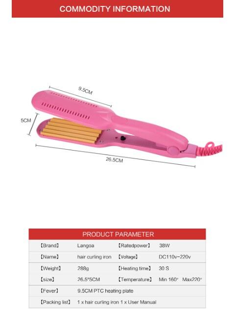 Dimenzija ploča je 50 mm x 95 mm. Pegla ima termostat do 220 stupnjeva. Kabel je okretni do 360 stupnjeva.