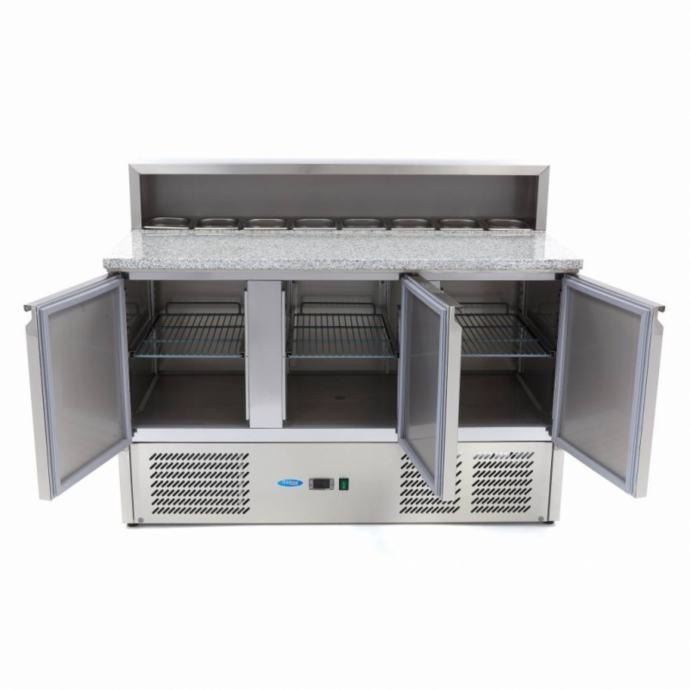 Granitni pult za pizzu Luksuzni pult za pizzu s kućištem od nehrđajućeg čelika i granitnom radnom površinom. Zapremina 8 x 1/6 GN posuda. • 3 vrata od nehrđajućeg čelika • S granitnom radnom pločom