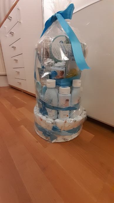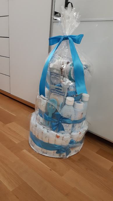Nova zapakirana torta od pelena na 3 kata (dm). Uz pelene dolazi sampon, puder, ulje, sapun, krema, skarice za nokte, cetka za kosu s cesljom, vlazne maramice i gricka za zube.