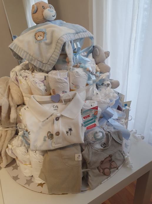 Uz tortu dolazi jako puno dodataka, bodiji, kompletici, mlijeko, kreme, šampon, kupka, žvakalica, vezica za dudu, tješilica, duda, dekica, tetra pelene, LRP kozmetika, igracka