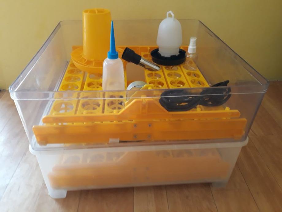 Odličan njemački inkubator. Kapacitet 96 jaja za leženje. Automatsko okretanje jaja, digitalni pokazivač vlage i temperature, svjetiljka za provjeru oplođenosti jaja, pojilica i hranilica idu uz inkubator. U ovaj inkubator mogu jaja peradi svih veličina. Kokoš, prepelica, fazan, (guska manja jaja), pura, s vrlo visokom stopom izlijeganja. Toplinska izolacija sa stiroporom, zaštita da se jaja ne pothlade. Potpuno NOV i provjereno dobar. Za više detalja nazovite me.
