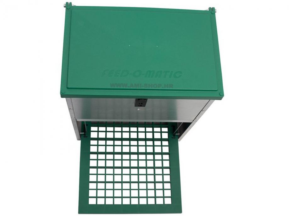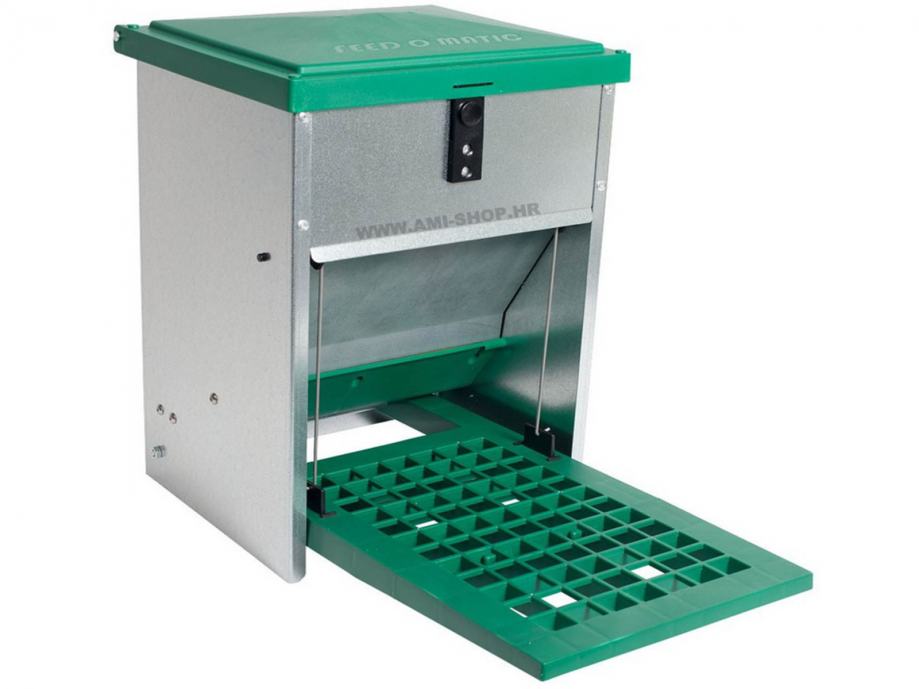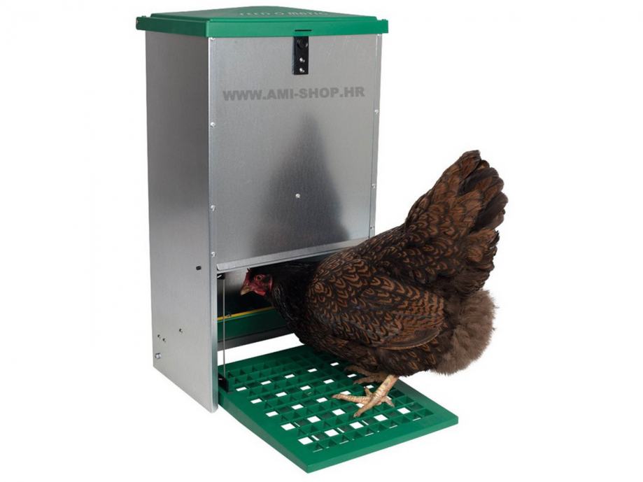Sa Feedomaticom, automatskom hranilicom 12 kg više neće biti doticaja sa miševima i pticama koje dolaze u kontakt sa hranom. Kada životinje (peradi) stanu na gazište, Feedomatic otvara preklop za pristup hrani. Na taj način štetočine, kao što su miševi i ptice, više ne mogu doći do hrane vaše peradi!