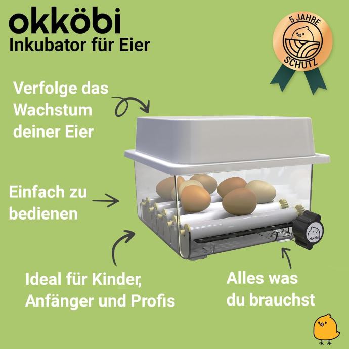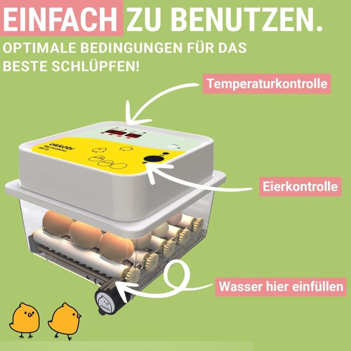 Jednostavan za korištenje za djecu, početnike i profesionalce. Inkubator je jednostavan za upotrebu i ne treba se sastavljati; idealan je uređaj za djecu i početnike. OBI-12 dolazi s jednostavnim uputama i digitalnim zaslonom koji točno prikazuje temperaturu i vlažnost. Sve što vam je potrebno za sljedeće izleganje uključeno je u isporuku: sve što morate učiniti je nabaviti jaja!