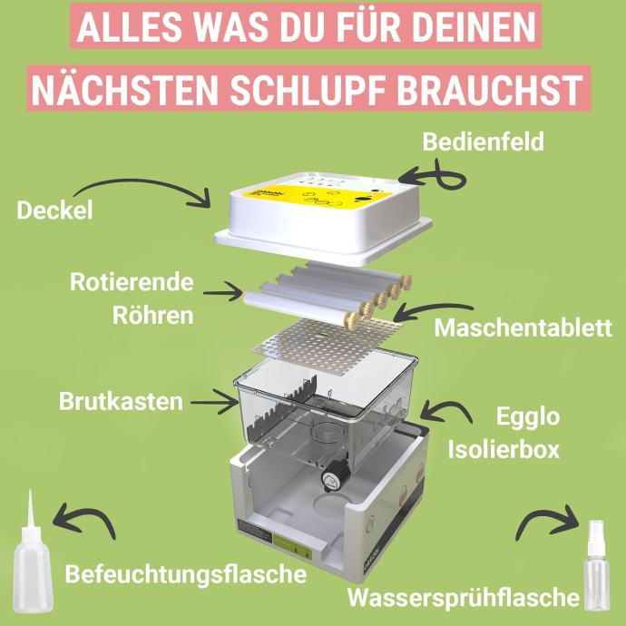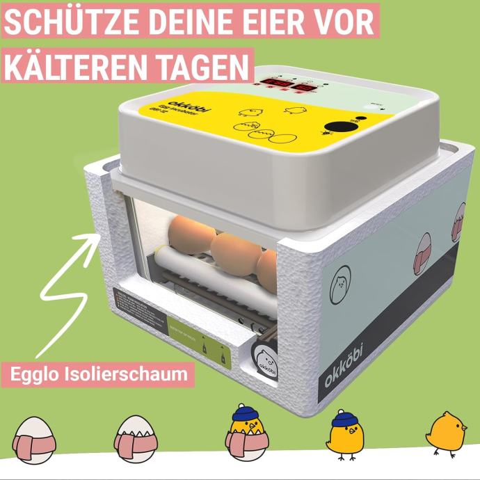 Normalna stopa izleganja je između 55% i 75%, ali može varirati zbog različitih okolišnih i bioloških faktora. Kada raspakirate inkubator za jaja, nemojte bacati izolacijsku pjenu jer je možete koristiti "Eggloo" pjenu u hladnijim vremenima kako biste svoja jaja održali dodatno toplima!