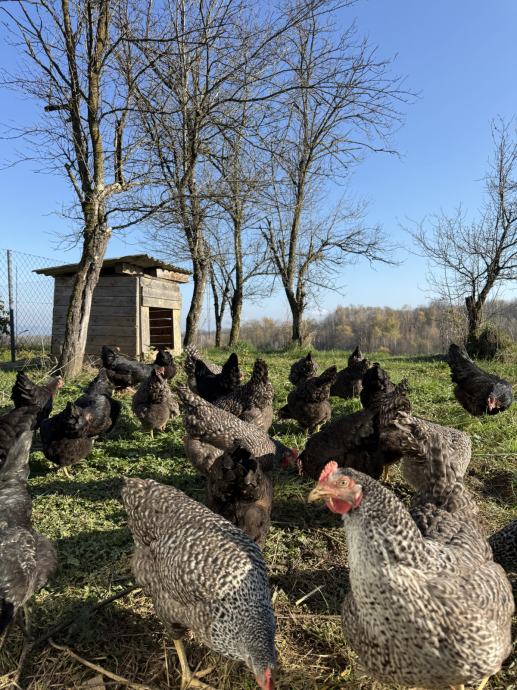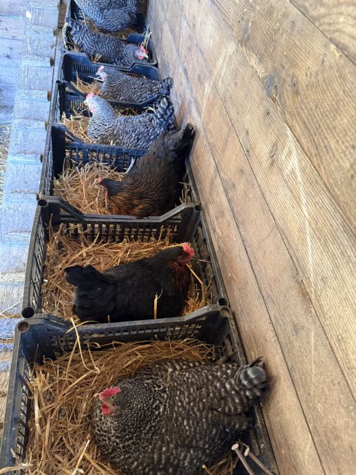 Višak mladih nesilica slovenske pasmine prelux, u crnoj i grahorastoj boji.