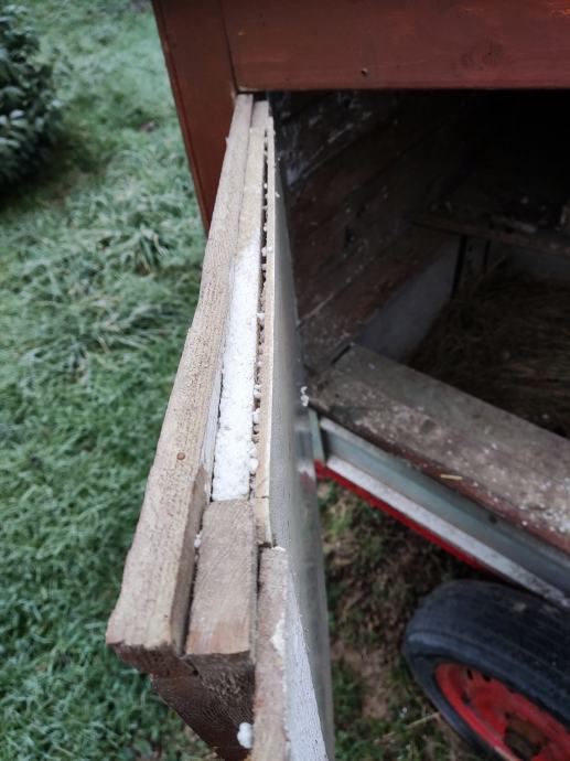 -ukupna dužina 490cm, od toga kućica na prikolici 140cm, a dužina vanjskog prostora za kokoši 350cm