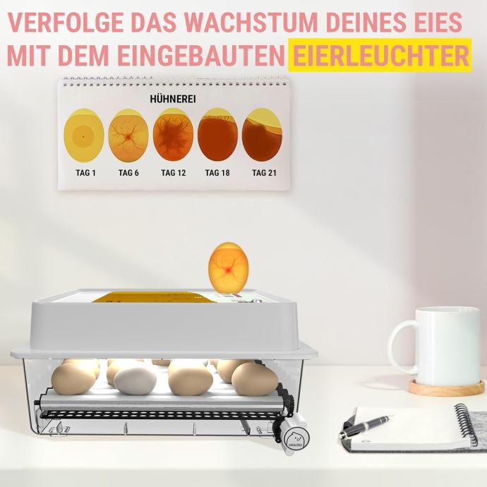Inkubator je dizajniran za smještaj različitih veličina jaja i može držati do 36 kokošjih jaja, a uključuje prilagodljive rotacijske cijevi za mala i velika jaja. Prije početka sezone razmnožavanja, jednostavno upotrijebite poseban gumb za odabir vrste za optimizirani uzgoj: kokoš, patka, guska, golub ili odaberite ručni način za druge vrste jaja.