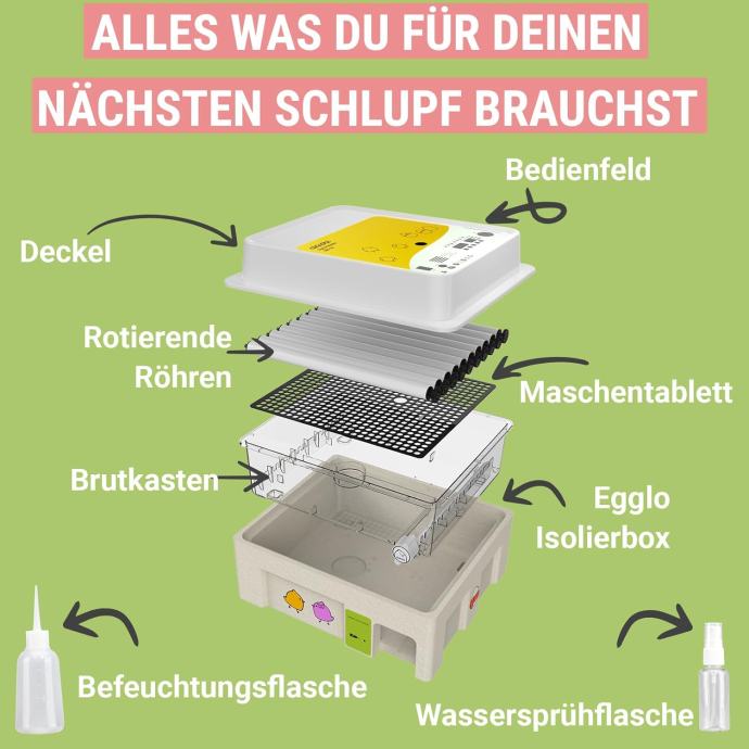 Sustav protoka zraka s ventilatorom osigurava stabilnu i homogenu raspodjelu temperature u inkubatoru, čime osigurava optimalne uvjete za jaja. Osim toga, zahvaljujući otvorima za dopunjavanje vode, možete kontrolirati vlažnost bez otvaranja poklopca i time spriječiti temperaturne fluktuacije. Uključena "Eggloo" izolacijska pjena štiti vaša jaja od hladnoće s vanjske strane.