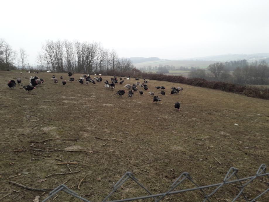 Imam purane i pure stare 6 mjeseci. Prodajem žive, ~100 komada. Cijena je 8€ po kg za više od 50 komada, purani su 5-8kg a pure ~3,5-4.