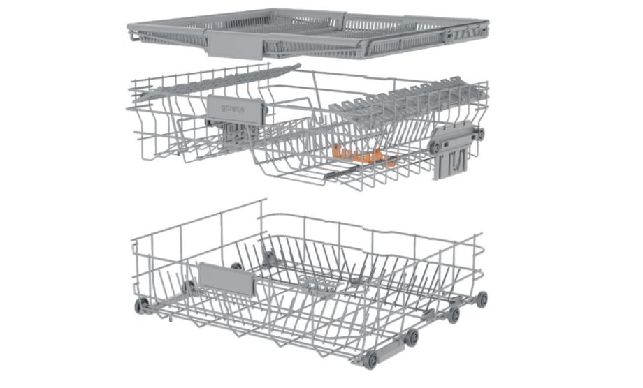 Gornja košara: Ručka s plastičnim logotipom, 4 držača za šalice, Široki držač za noževe, Fiksni držač za čaše, Fiksni držači, Sklopivi/djeljivi lijevi držač za čaše, Desna sklopiva polica CupHolder za čaše, Lijeva sklopiva polica CupHolder za čaše, Ručka, Široka mreža