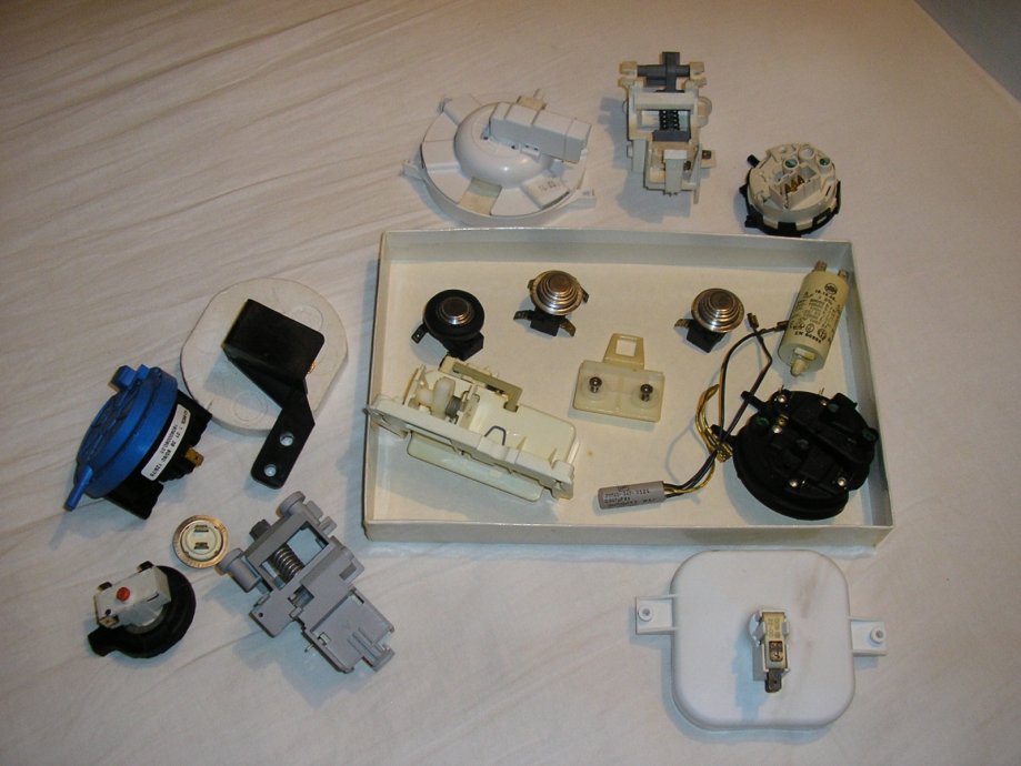 -razni elektro dijelovi:termostati,presostati,brave vrata,prekidači,plovci,pumpe,motori,grijači,labirinti,itd.