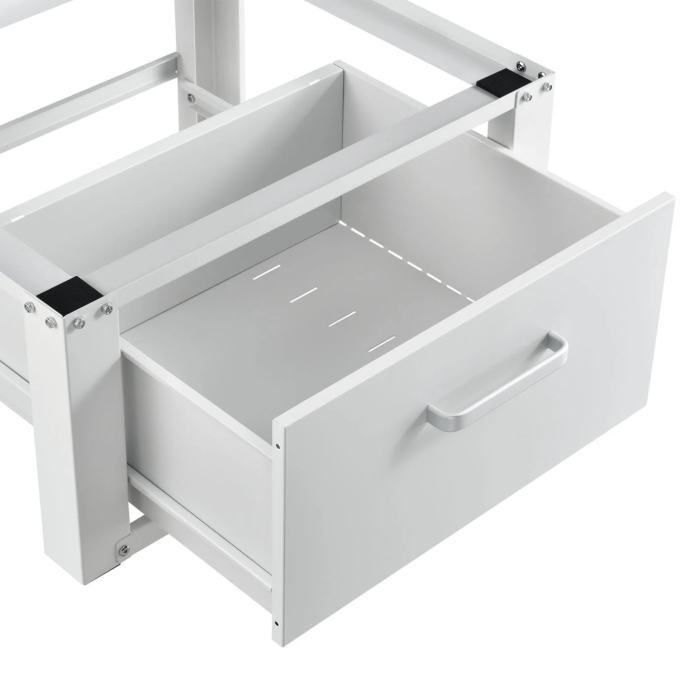 Materijal i boja: Baza je izrađena od čelika s aluminijskom ručkom za ladicu, što osigurava dugotrajnost i jednostavno održavanje. Bijela boja pristaje uz različite prostore i estetike.