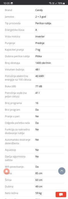 Perilica rublja Candy kupljena u srpnju prošle godine. Ispravna, ali ipak premala za naše potrebe (7kg). A kategorije, do 1400 okretaja. Karakteristike vidljive i u galeriji. Nije često korištena.