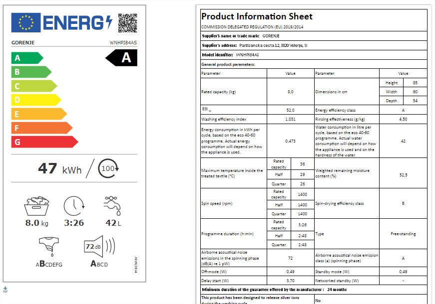 GORENJE WNHPI84AS je savršen partner za održavanje rublja čistim i svježim. Sa snagom od 1400 okretaja centrifuge u minuti, tvoje rublje će biti besprijekorno čisto i gotovo suho. Ova perilica ima energijsku klasu A, što znači da će ti pomoći u uštedi energije. Inverter PowerDrive motor osigurava dugotrajnost i tihu operaciju, a SteamTech tehnologija omogućuje svježe i dezinficirane tkanine.