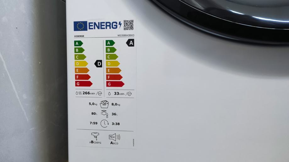 Energetski razred: A za pranje, D za kombinirani ciklus pranja i sušenja.