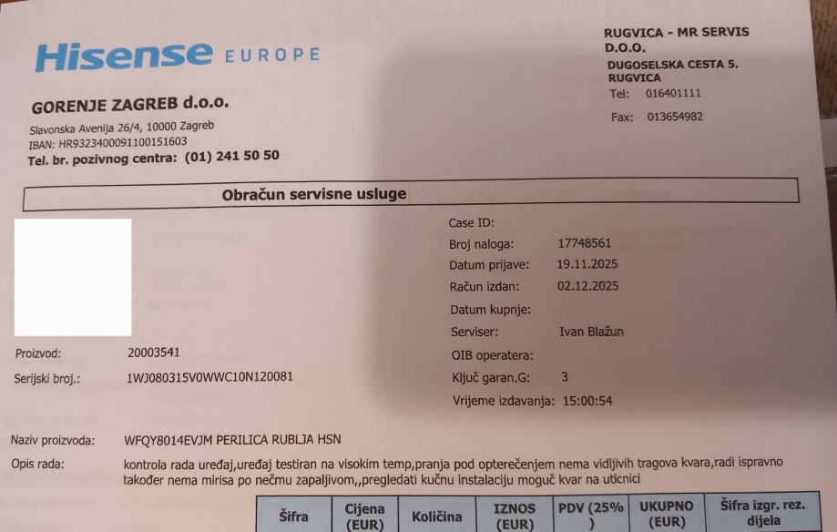 Prodajem rabljenu perilicu rublja Hisense WFQY8014EVJM čije jamstvo/osiguranje vrijedi do 4.8.2027. Perilica je ispravna i spremna za korištenje što potvrđuje servisna dijagnistika izvršena 2.12.2025. u ovlaštenom servisu.