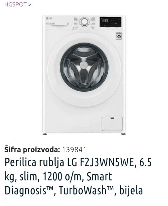 Perilica LG sa kvarom gdje treba ležaj promijeniti koji košta sa semeringom cca 30 eura, 6.5 kg, direktni motor bez remena, dok je sve ostalo ispravno, tko zna promijenit ležaj sam - isplativa investicija, nova košta 400 eura ovisno trgovine, prodajem
