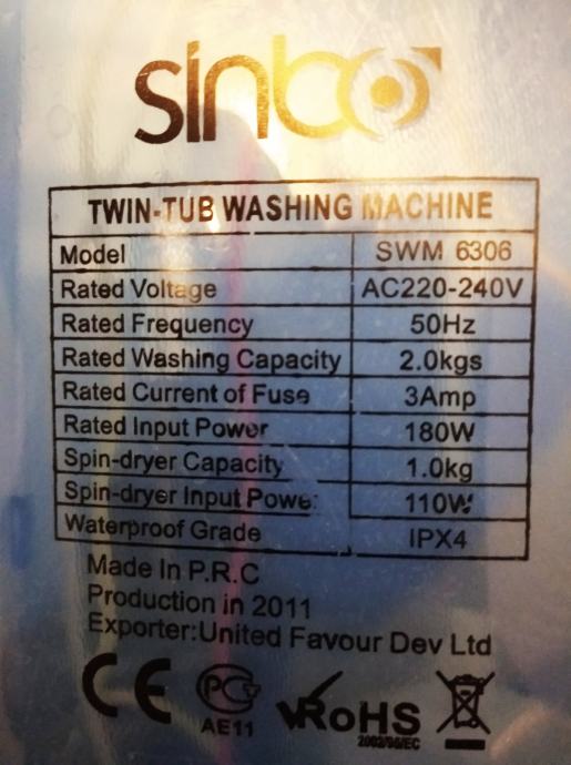 PRODAJEM NEISPRAVNU MINI PERILICU RUBLJA MARKE " SIMBO " MODEL SWM 6306 - TWIN - TUB WASHING MACHINE, POGODNU ZA SAMCE, STUDENTE, TE ZA KAMPIRANJE !