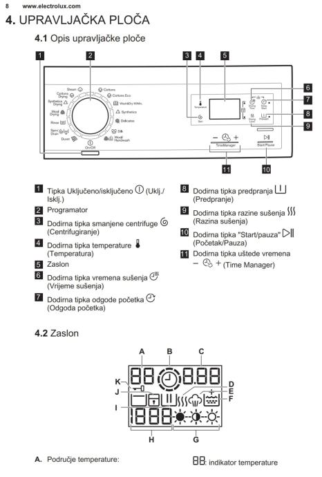 Programi: on/off, pamuk, pamuk ekonomično, 60min 2in1, sintetika, osjetljivo, svila, vuna +, Krevetnina, centrifuga/odvodnja, ispiranje, vuna sušenje, sintetika sušenje, pamuk sušenje, Steam Refresh/Anticrease