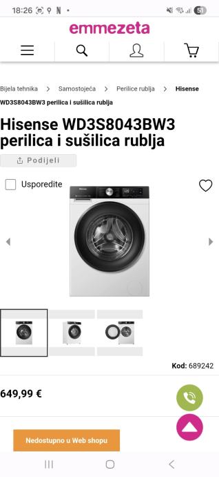 Prodajem Hisense perilicu i sušilicu rublja, model WD3S8043BW3. Uređaj kombinira funkcije pranja i sušenja u jednom aparatu. Bijele boje s crnim detaljima na kontrolnoj ploči.