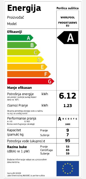 Perilica sušilica rublja Whirpool 9 kg / 7 kg - A energetski razred