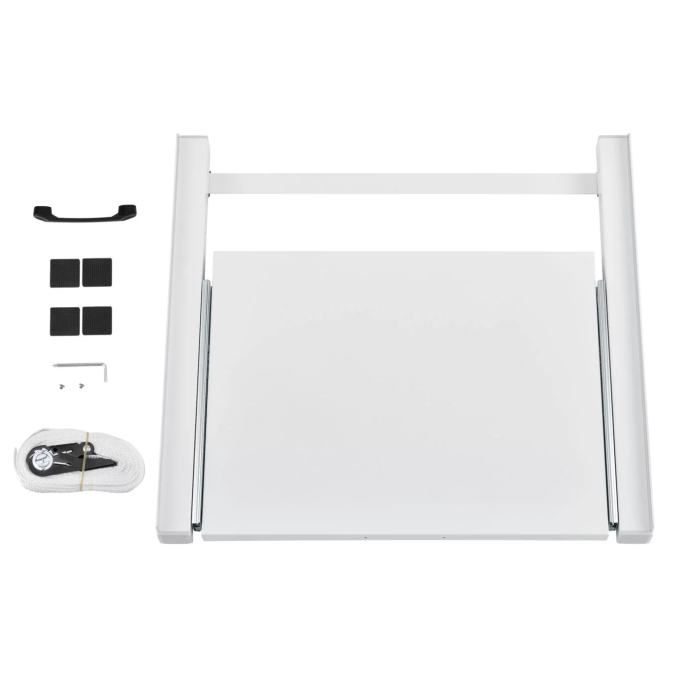 Priključni okvir za perilicu/sušilicu s pločom za odlaganje dizajniran je za učinkovito postavljanje velikih kućanskih uređaja koji štede prostor, posebno perilica i sušilica. Može se pohvaliti integriranom radnom pločom na izvlačenje koja omogućuje praktično odlaganje rublja.