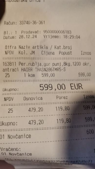 Prodaje se Nova Perilica rublja marke Haier(nije koristena, u kutiji od prvog dana kad je kupljena) sa garancijom stara 3 mj. Perilica ima gornji otvor za ves te prima 8 kg vesa.