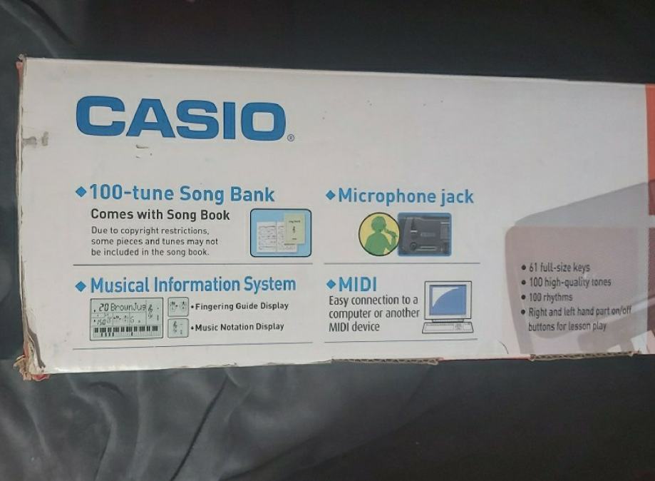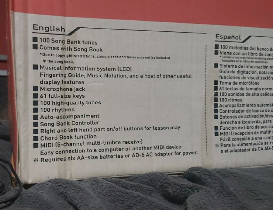 •Comes with song book and music stand•Size (W x D x H): 956 x 355 x 132mm•Weight: 4.0kg•Batteries: AA-size x 6
