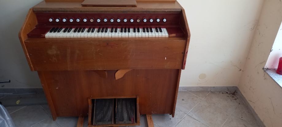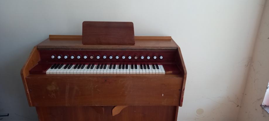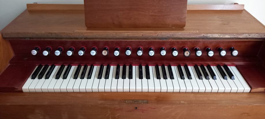 1. Funkcionalni historijski "harmonium". Instrument je preko 100 godina star. Sviranje se vrši preko pumpanja (mieha/zračnog jastuka) koji se napuhava preko dvije "ladice" na nožni pogon.