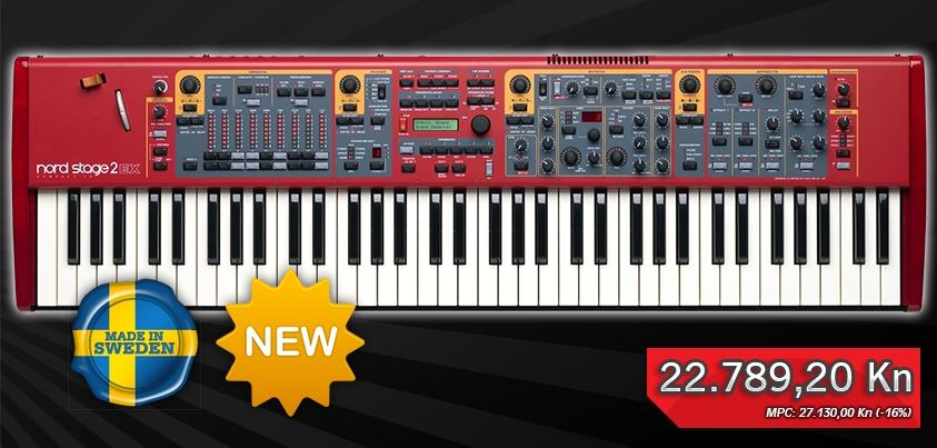 73 tipke, pet grand pianoa, sedam upright pianoa, 11 električnih pianoa, te još mnogo toga! - Nord Stage 2 EX Compact stage piano spreman je za gažu čim ga izvadite iz kutije! Od sada nadograđen s 1GB memorije za Nord Piano biblioteku, tako da od sada možete imati još više realističnih reprodukcija širokog spektra instrumenata. Direktno iz gornje kontrolne ploče imate jednostavan pristup piano zvukovima, orguljama, synthesizerima, te generatorima zvuka. Istovremeno možete koristiti tri zvuka kako biste dobili široke i bogate zvukove. S izuzetnom kvalitetom zvuka i malom težinom, Nord Stage 2 EX Compact izvrsan je stage piano bilo da ga koristite na pozornici ili u studiju.