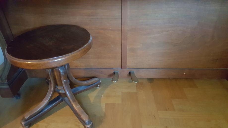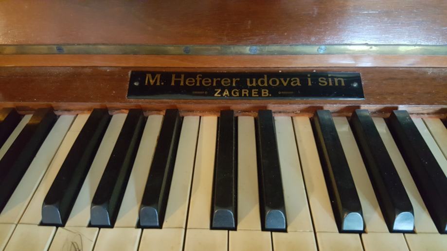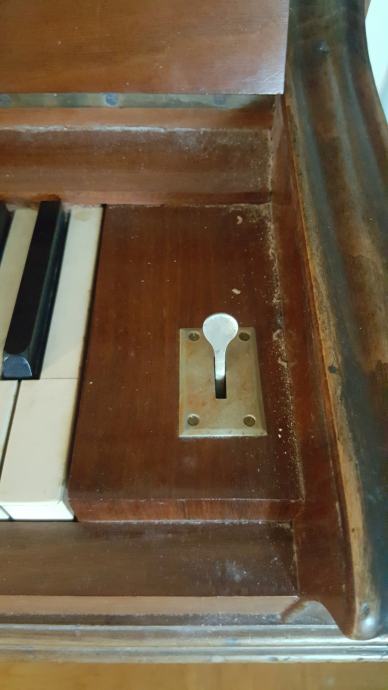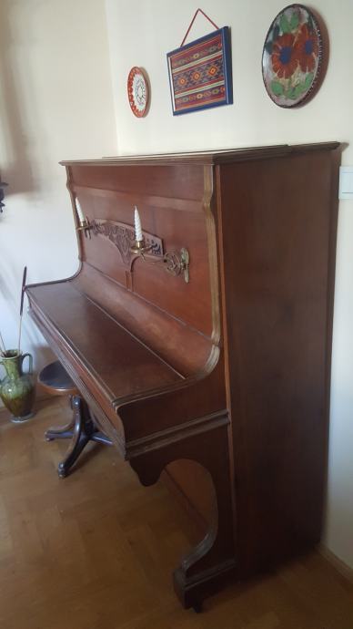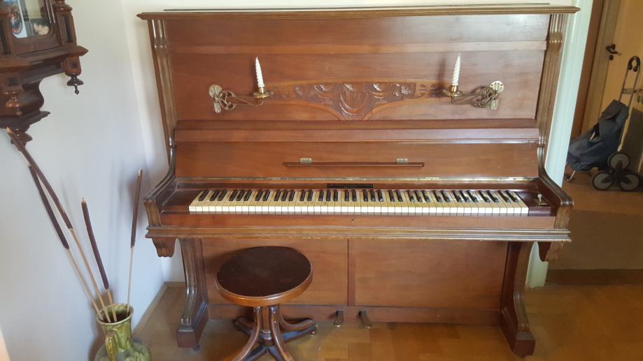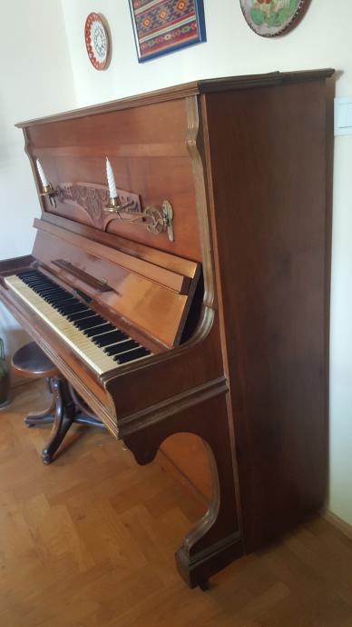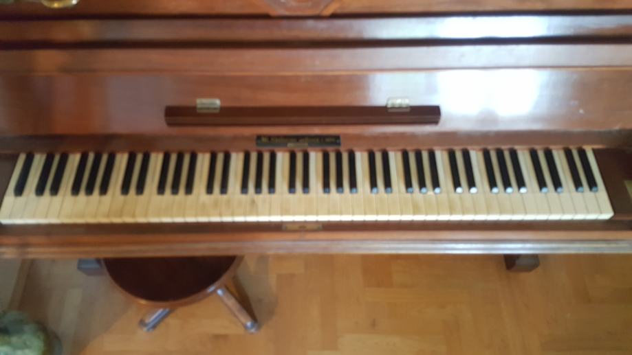 Drveni politirani korpus pianina podijeljen je na dva dijela. Odjeljuje ih u prostor istaknuti središnji dio u kojemu je smještena klavijatura s gornjim crnim i donjim bijelim tipkama opsega sedam oktava (2A-a4). Dodatna ručica za pojačavanje i stišavanje zvuka kod klavijatura. Gornji dio dekoriran je mjedenim reljefom u formi krila unutar kojega je prisutan stilizirani florealni motiv. Navedeni reljef sa svake je strane flankiran s mjedenim konzolnim svijećnjakom. Ispod ruba donjega dijela postavljena su dva pedala. Bočni je obris korpusa profiliran s dva izbočenja i uleknućem.