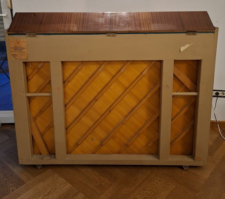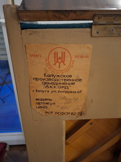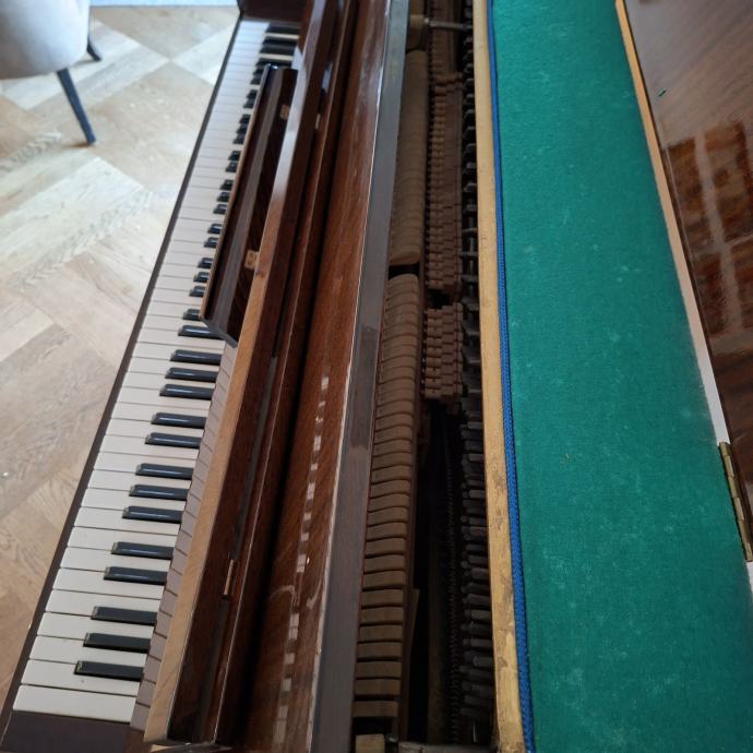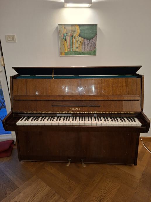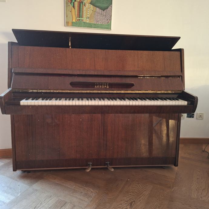 Pianino marke Akord sa dvije pedale. Uštiman, očuvan. Pianino se koristio za vježbanje i užitak muziciranja.