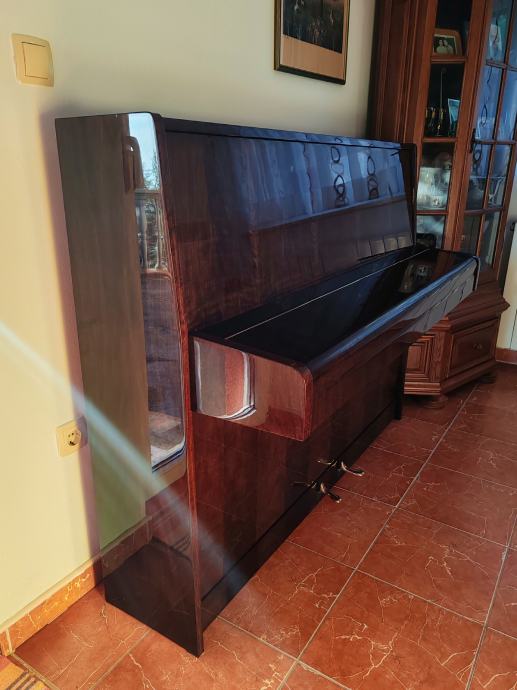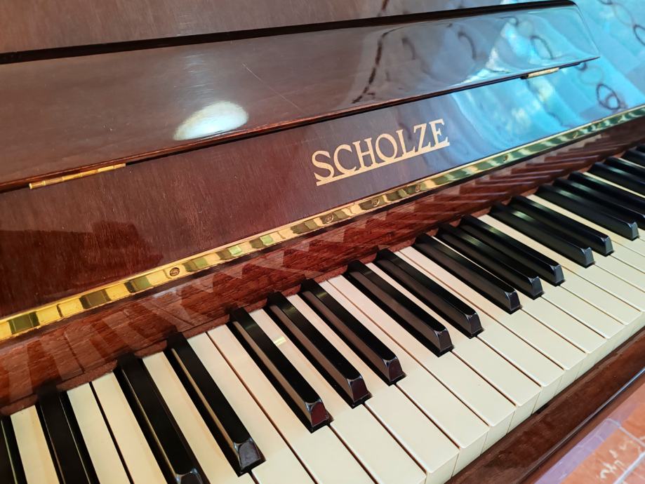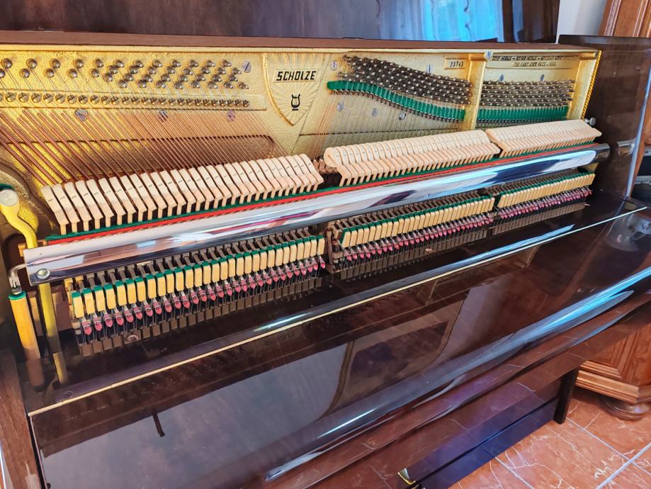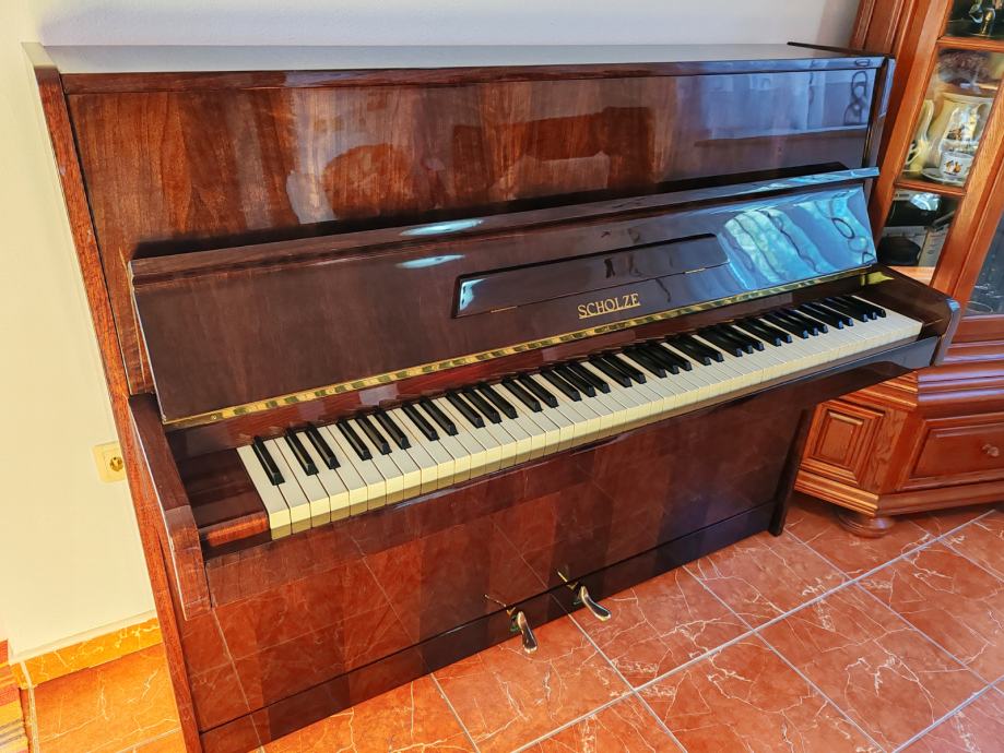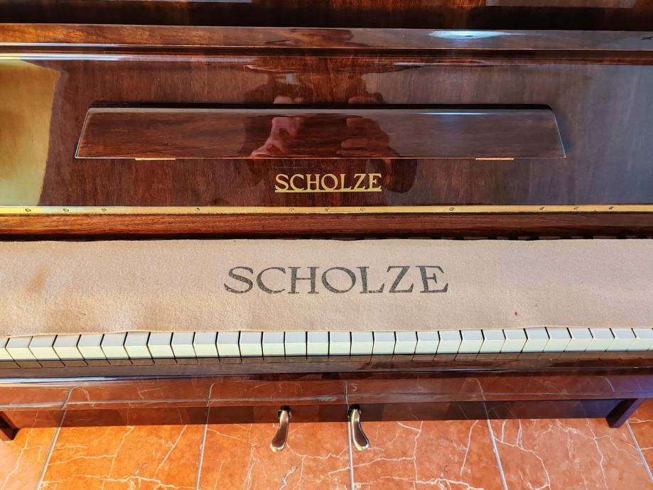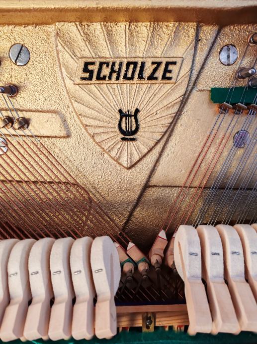 Prodaje se nevjerovatno očuvani i visoko kvalitetni pianino Scholze (Petrof). Prva je ruka i nije istrošen. Uvijek stajao u suhom, daleko od radijatora, vlage i sunca. Smeđe je boje, ima visoki, tvornički sjaj i nije izblijedio od sunca kako to obično bude uobičajeno. Idealan je za nastavu klavira tj. za vježbanje kroz sve stupnjeve školovanja a pogotovo za učenike i studente koji se s glazbom žele ozbiljnije baviti. Rijetko ćete naći ovako očuvan pianino a za ovaj to vrijedi koliko za mehaničke unutarnje dijelove, toliko i za njegovu vanjštinu. Jako malo je zapravo sviran. Odlično drži štim, batići imaju dovoljno "mesa" a svi filcevi i remenčići su nepotrošeni što zna biti rijetkost i boljka za rabljene klavire. Pianino je ugođen nedavno dva puta prije prodaje i pregledan te nema nikakvih daljnjih ulaganja. Mehanika je također kompletno izregulirana.