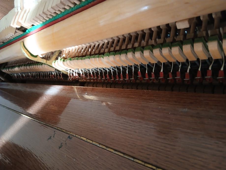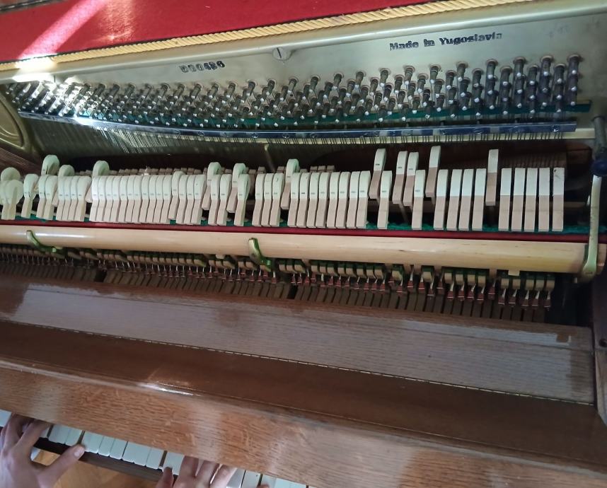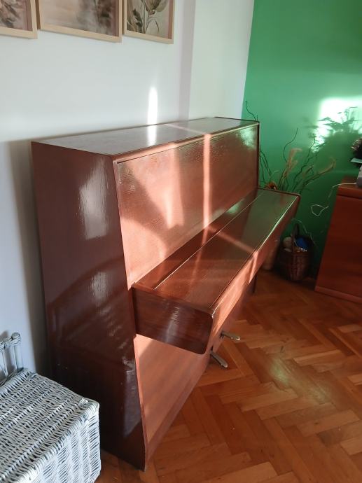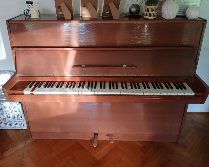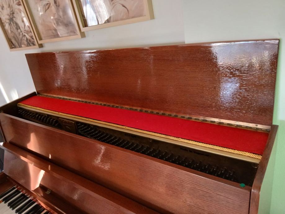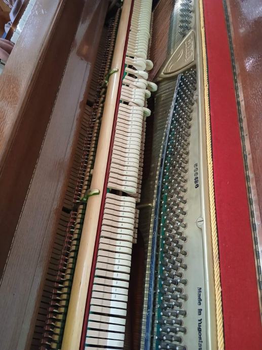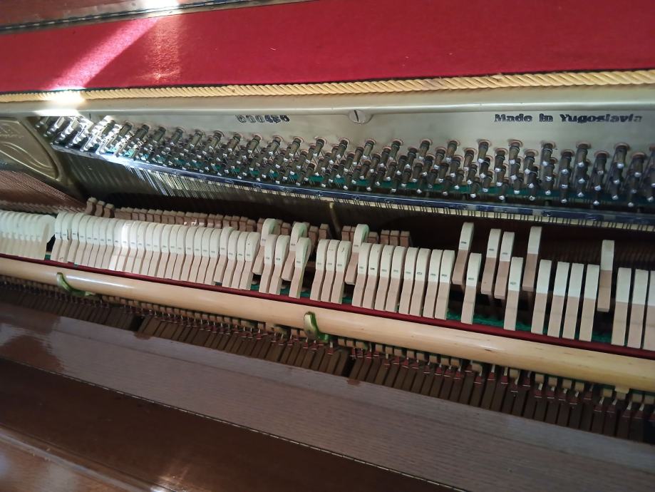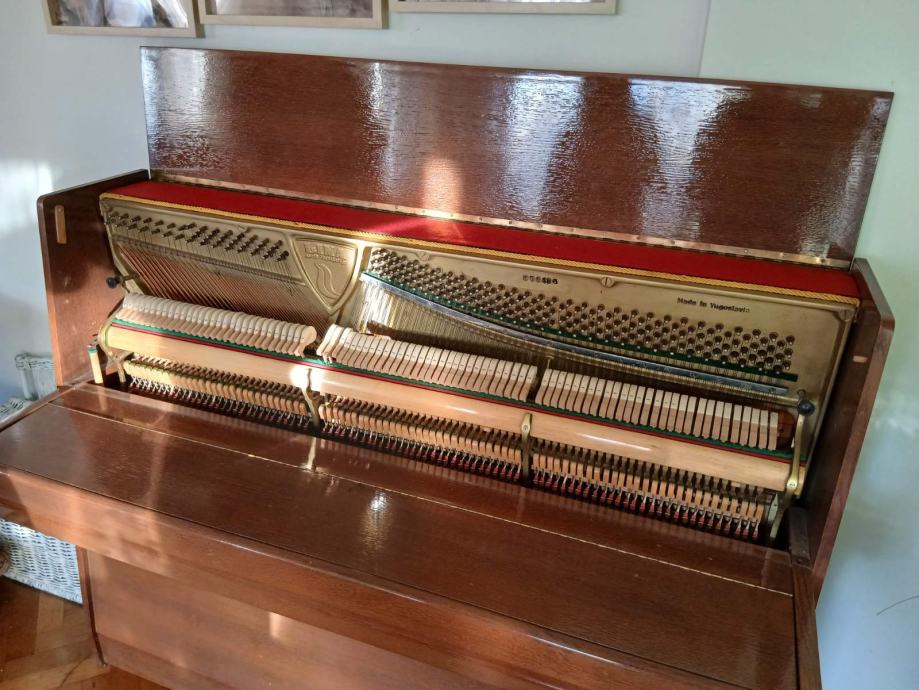 Prodajem pianino u vrlo dobrom estetskom stanju. Instrument je vizualno iznimno lijepo lakiran i obrađen, s ručno rađenim kućištem izrađenim po narudžbi. Pianino nije korišten duže vrijeme, pa ga je potrebno naštimati. Na jednoj tipki nedostaje bijeli pokrov, lijeva pedala (za stišavanje zvuka) se treba povezati što je manji nedostatak i lako se može popraviti.