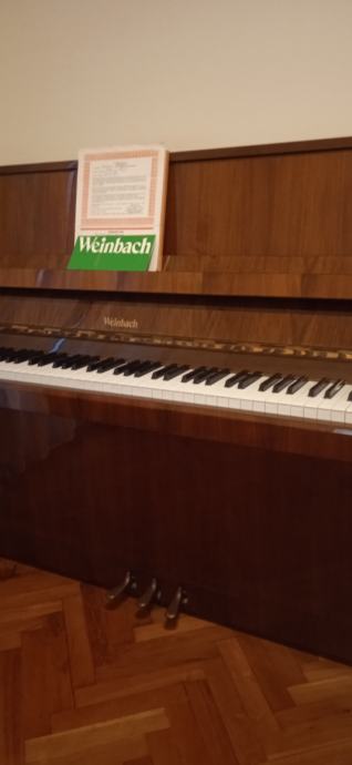 Prodajem Weinbach pianino proizveden 1990. godine, malo korišten, u odličnom stanju. Prva vlasnica, posjedujem papire o kupnji, nalazi se na lokaciji u Zagrebu, Remete. Uz kupnju klavira poklanjam note za sviranje klavira.