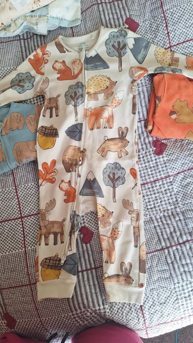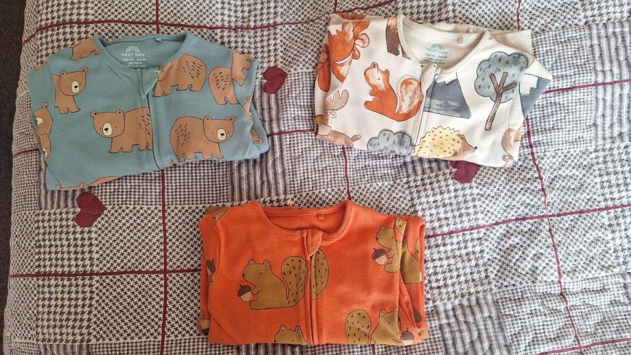 Prodajem set od 3 jednodjelne pidžame marke Next za bebe. Sve tri pidžame su od 100% pamuka, s dugim rukavima, veličine 80. Šarene su s motivima šumskih životinja. Materijal je mekan i ugodan