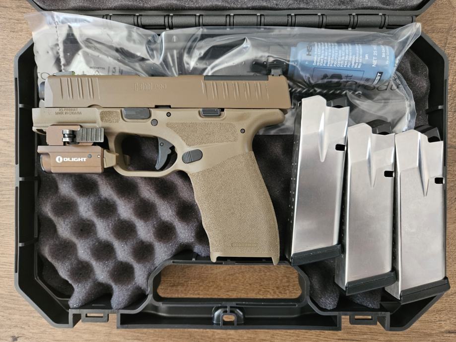 Prodajem gotovo nerabljeni HS H11 PRO/Hellcat PRO FDE kalibra 9x19 mm. Uz pištolj dolazi original kutija, meka torbica za transport, 3 spremnika zapremnine 15 metaka, lampa Olight PL-2 Mini Valkyrie, noćni prednji ciljnik Meprolight i dodatni fiberoptički ciljnik, set za čišćenje i upute za upotrebu. PRODAJEM ISKLJUČIVO OSOBI SA VAŽEĆOM NABAVNOM DOZVOLOM ZA KRATKO VATRENO ORUŽUJE.