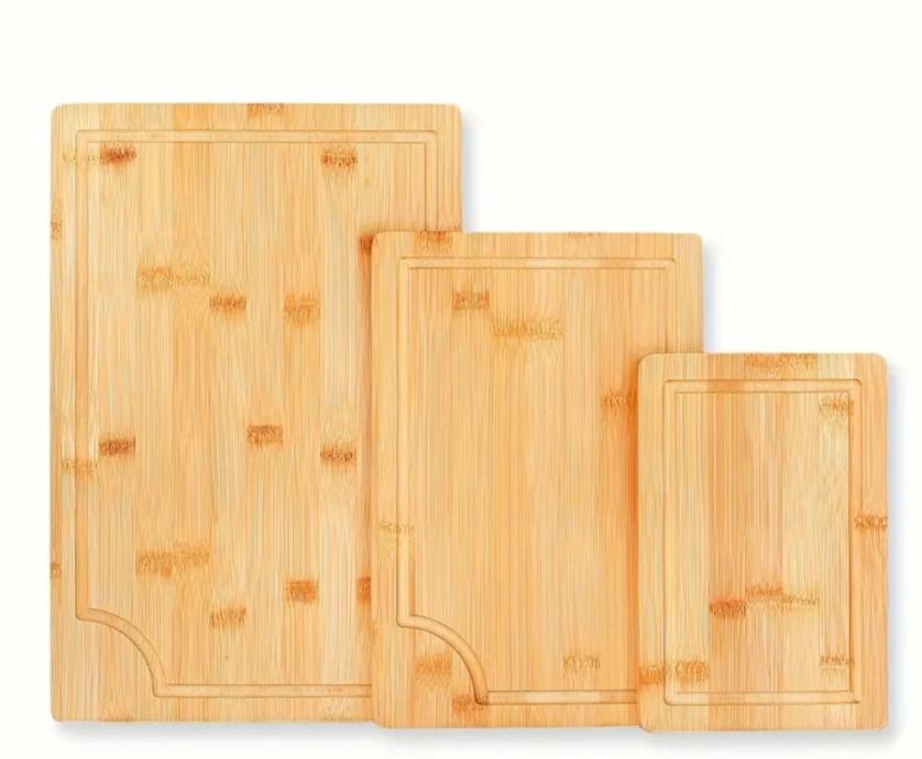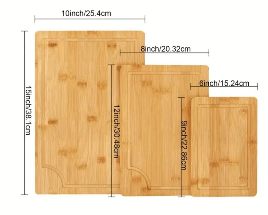 Komplet 3 daščice za rezanje od bambusa u prirodnoj boji . Dimenzije u cm : najveća 38x25x1,5. Srednja 30x20x1,5
