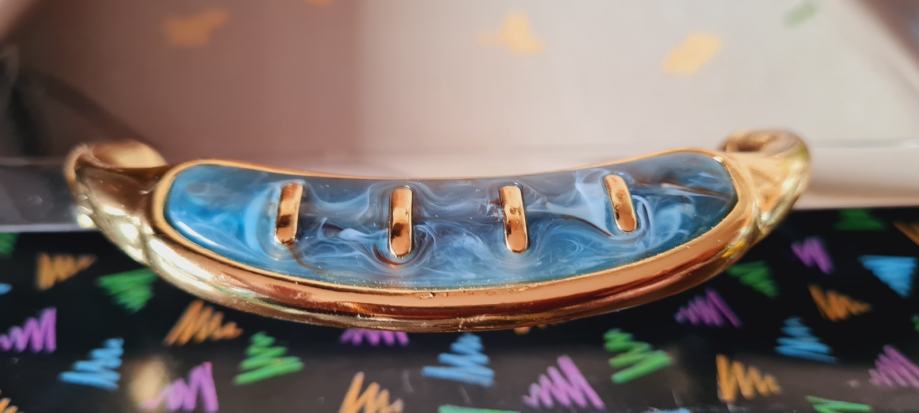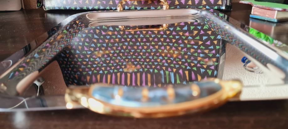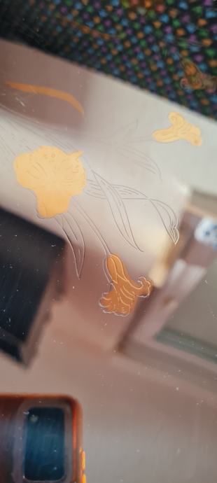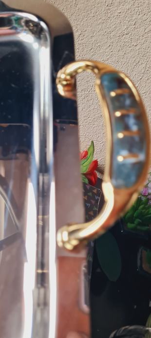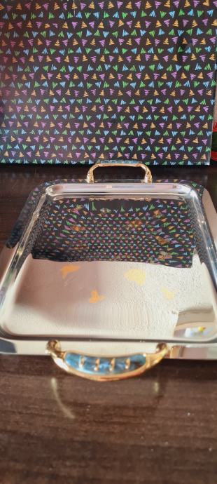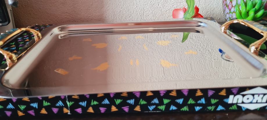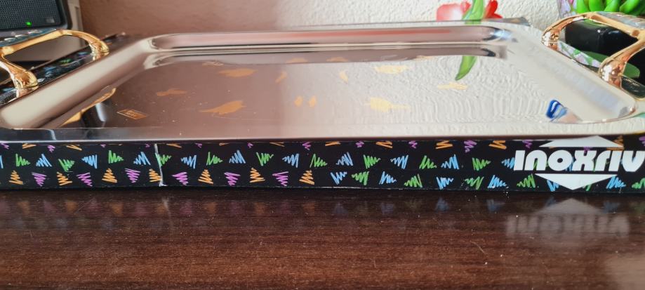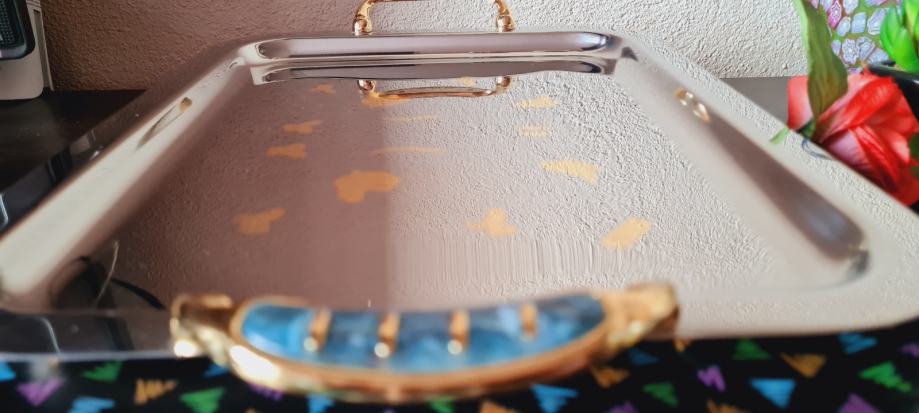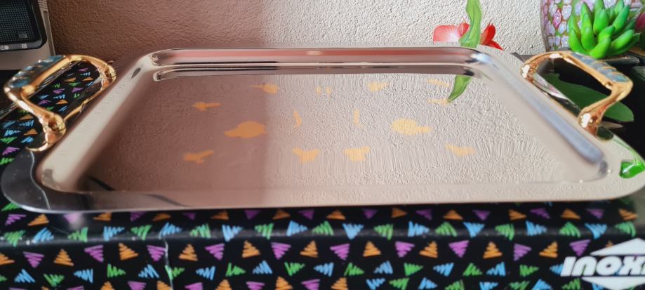 Pladanj, inox 18 / 10. Neupotrebljavano. Ručke su boje zlata, sa mramornim uzorkom, a cvjetovi na tacni su isto boje zlata.