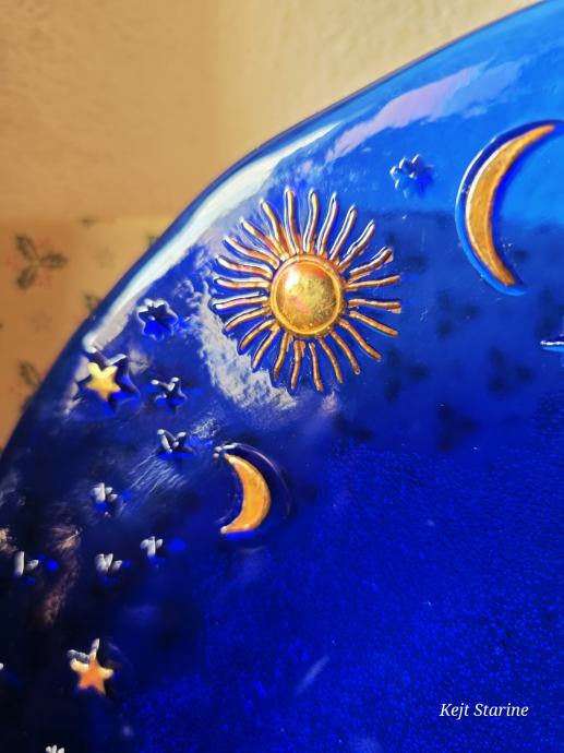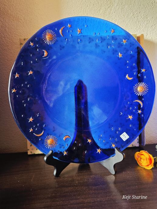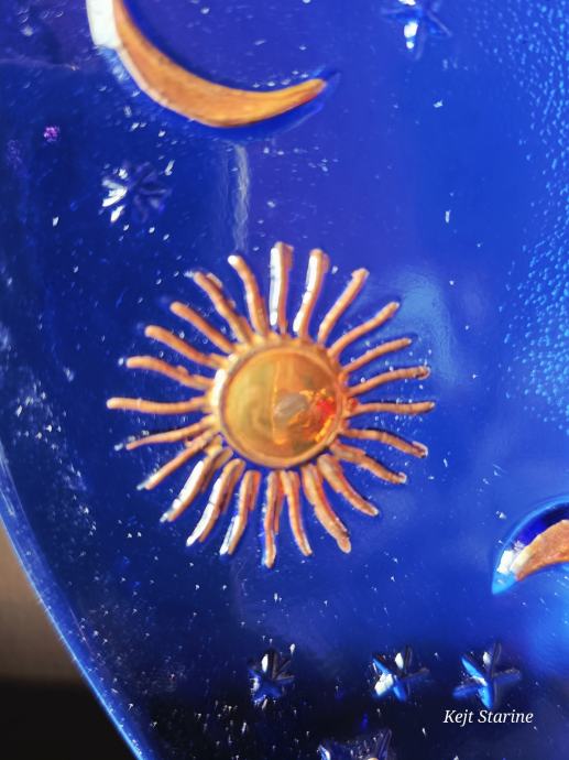 Vintage IVV Italy kobaltno plavi stakleni pladanj s motivima neba, uključujući sunce, mjesec i zvijezde.