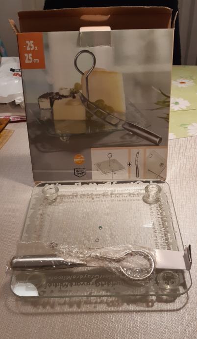 Pladanj za rezanje i posluživanje sireva, prodajem. Dimenzije 25x25 cm. Debela staklena ploča s nožicama i inox (rostfrei) držačem u sredini. Uz pladanj dolazi i inox (rostfrei) nož za rezanje sira. Sve kao na slici. Nekorišteno.
