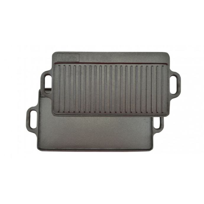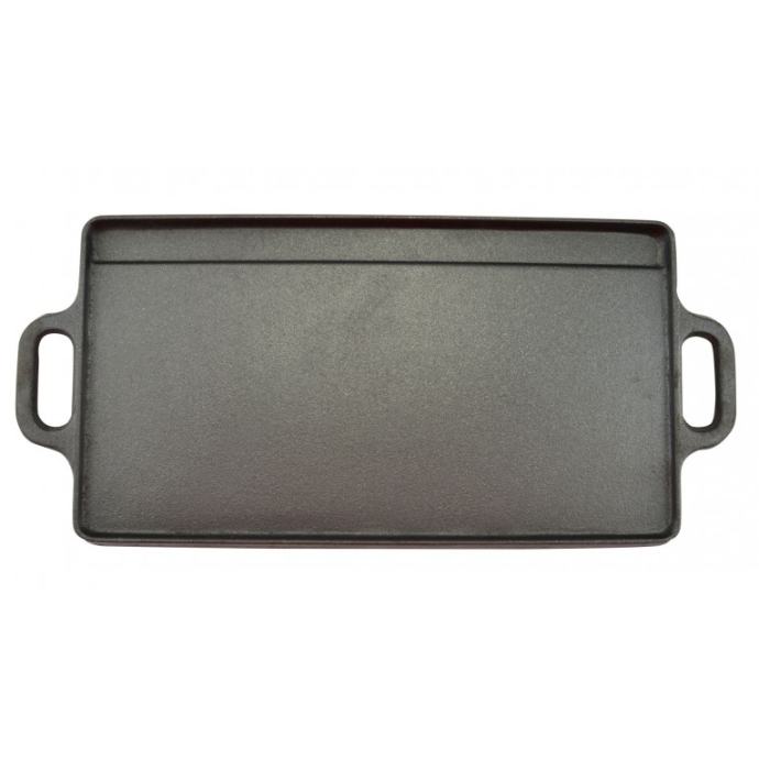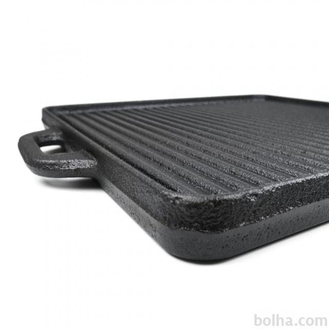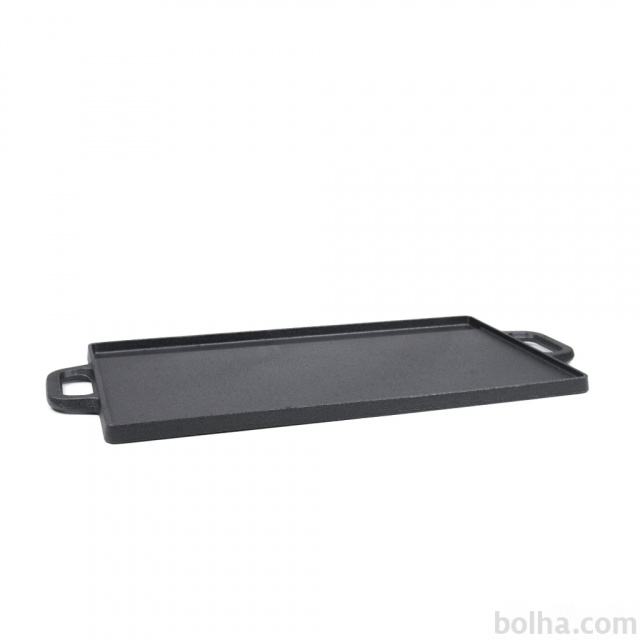 Nova ploča od lijevanog željeza dimenzija 24cm x 51cm. Upotrebljiv s obje strane, gladak s jedne i rebrasti s druge strane. Može se koristiti na plamenicima ili na otvorenoj vatri.