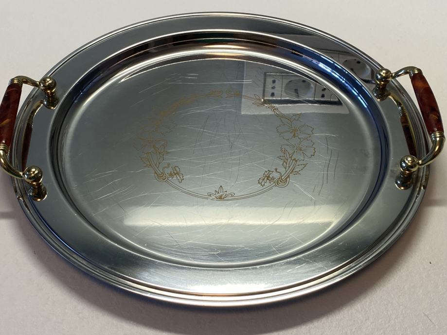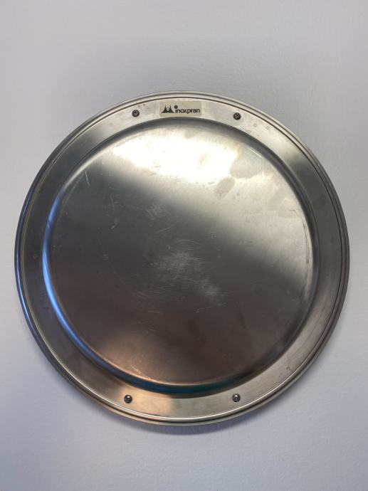 Rabljeni poslužavnik od inoxa (nehrđajećeg čelika). Promjer 31 cm.