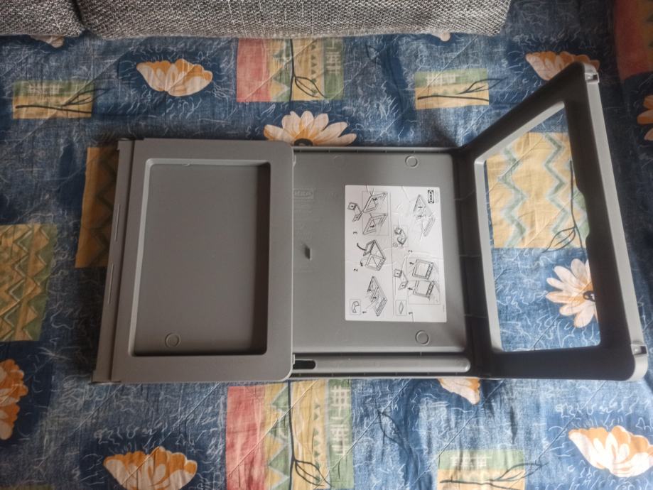Ima utor za knjigu ili tablet, otvor za kabel, sklopive nogice, sklopljen ne zauzima puno prostora,lako se sastavlja