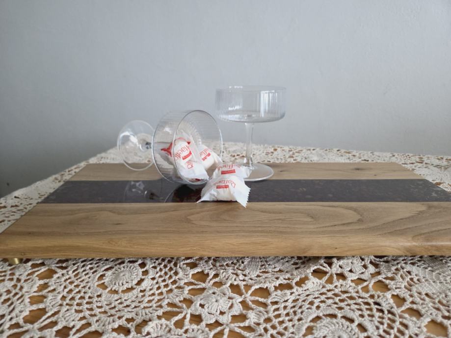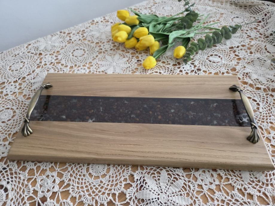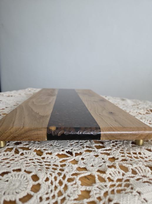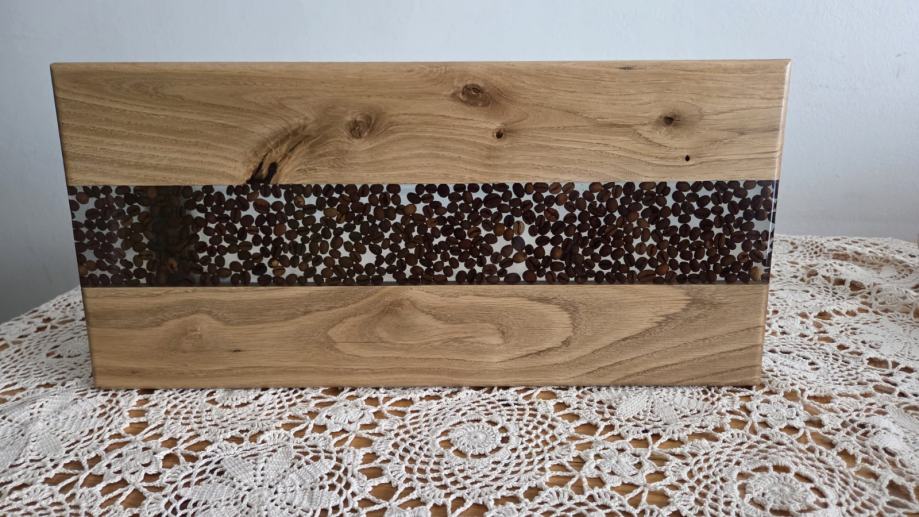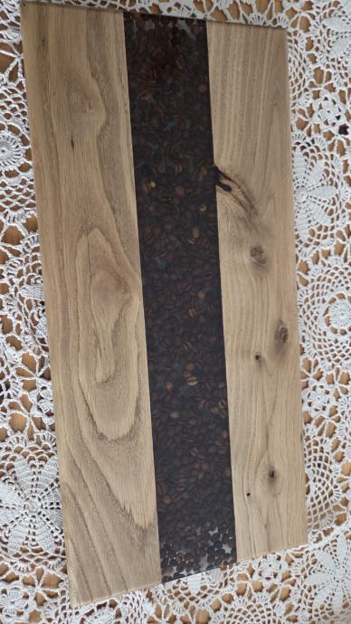 Prodajem ručno izrađenu dasku za serviranje od hrasta s dekorativnim umetkom od epoxy smole i pravih zrna kave. Svaka daska je jedinstvena, pažljivo brušena i zaštićena Osmo uljem sigurnim za kontakt s hranom.