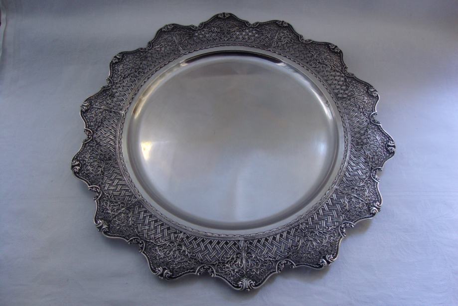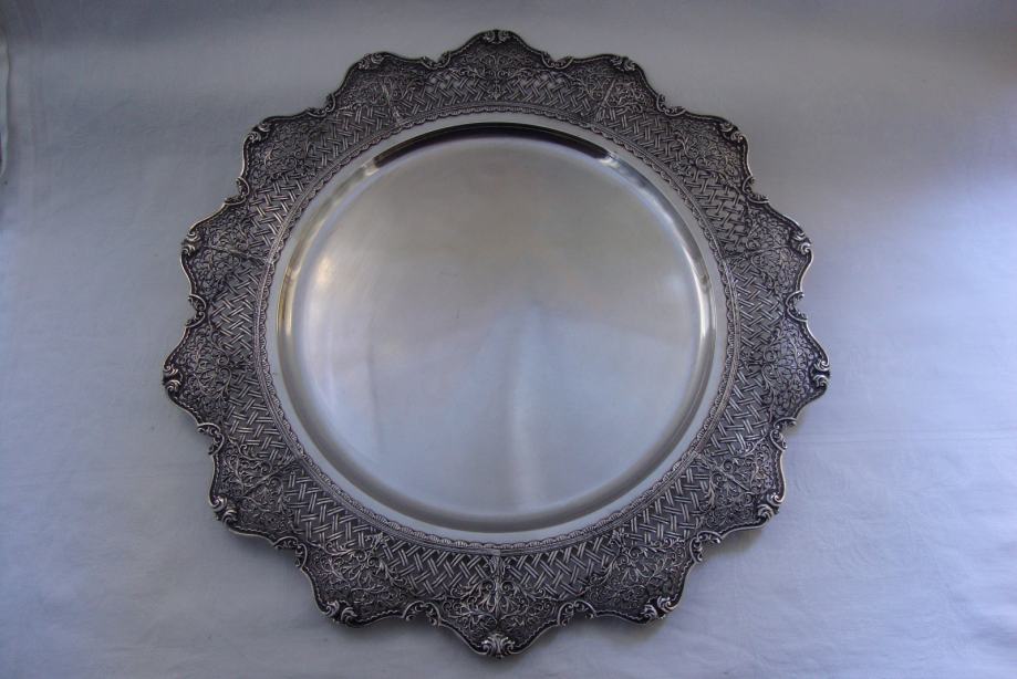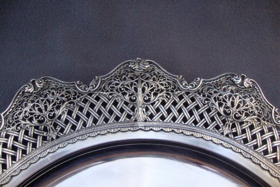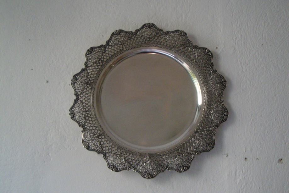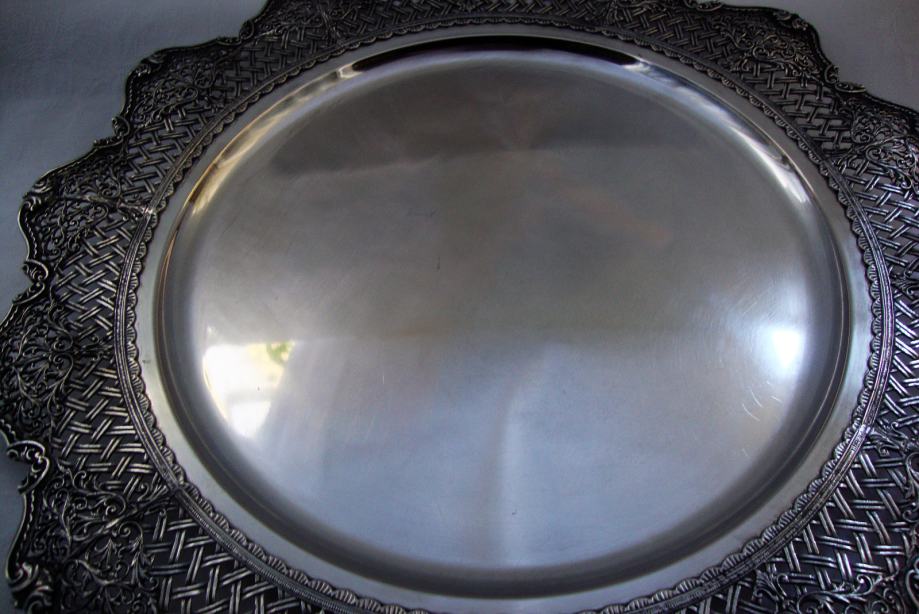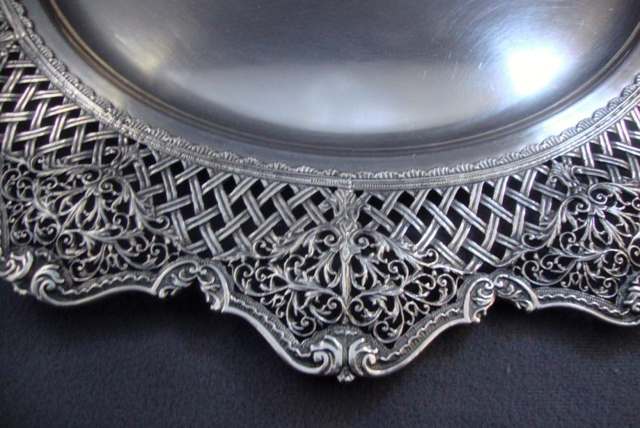 Veliki starinski srebrni pladanj tanjur ručno kovan , predivno rubno ukrašen cvjetnim motivima i pletom košarice izgleda poput najfinije čipke