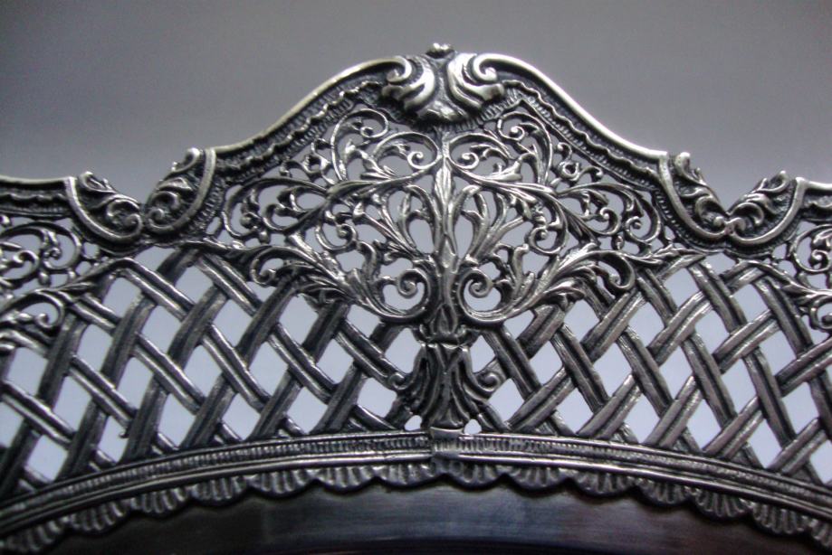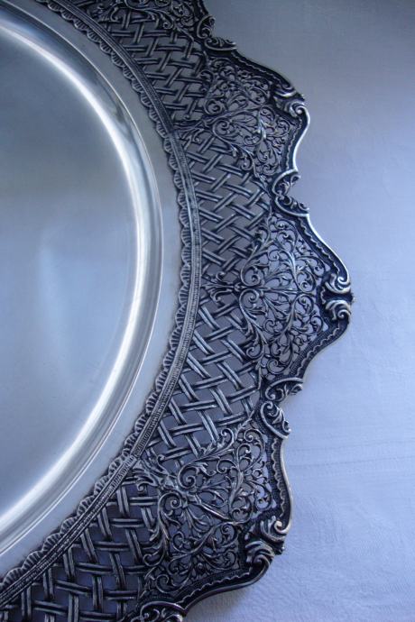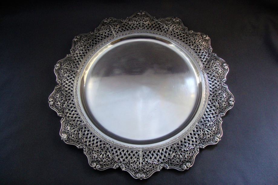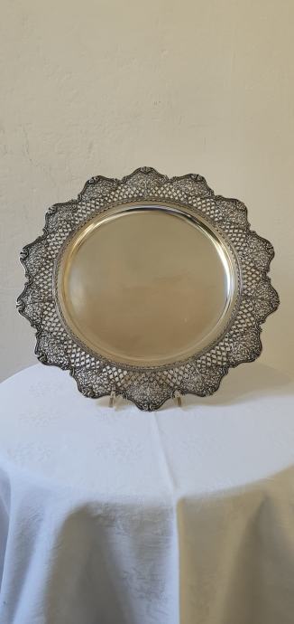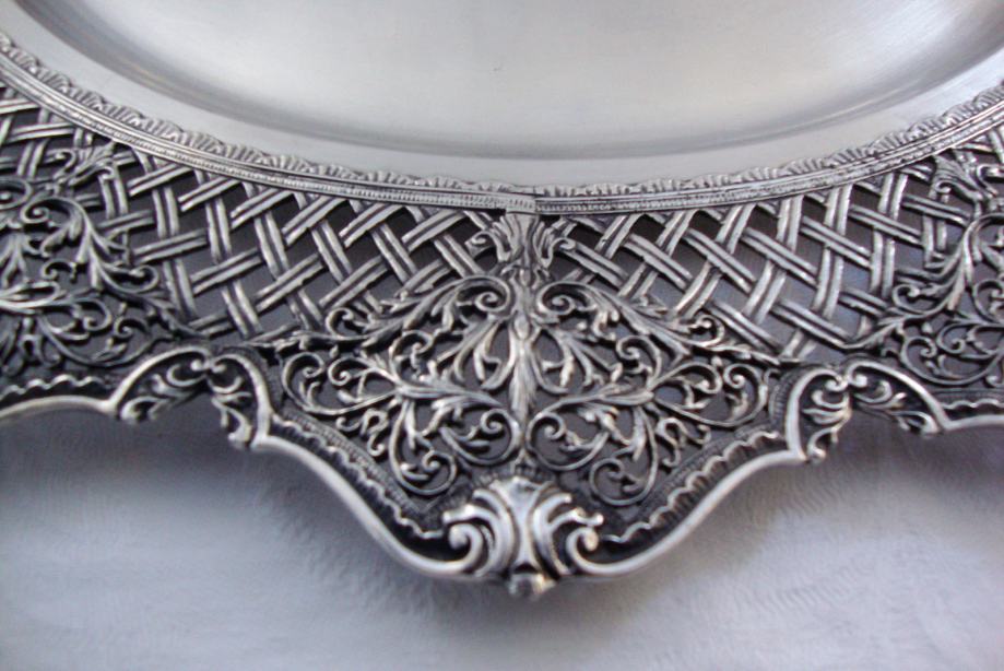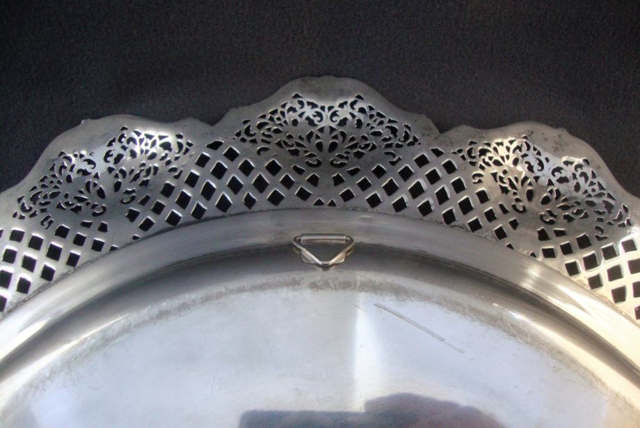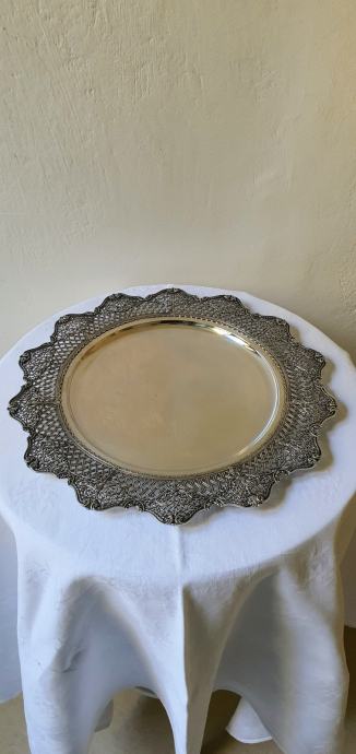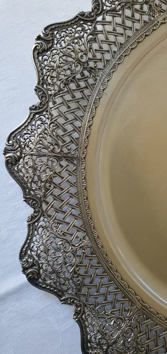Veliki starinski srebrni pladanj tanjur ručno kovan , predivno rubno ukrašen cvjetnim motivima i pletom košarice izgleda poput najfinije čipke